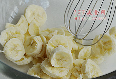 2、将香蕉去皮、切成小片、再用打蛋器捣成香蕉泥,尽量捣碎些。