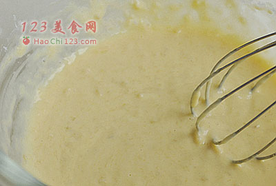 5、拌匀。将面糊静置5分钟。这5分钟干什么呢?——马上去洗刚才用过的筛子、打蛋器、盘子碗,用水冲一冲就很容易洗干净,如果放在那儿等松饼做好再洗就都干透了,不好洗。