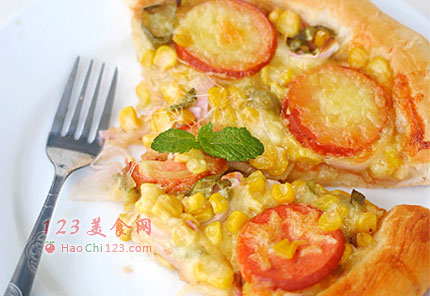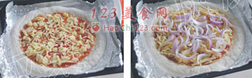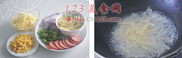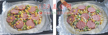 6、然后铺上土豆丝、洋葱丝、再撒少量奶酪丝,再铺上火腿、青椒、玉米粒。