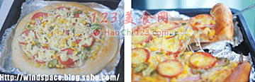 8、取出面饼,将剩余的奶酪丝均匀撒在饼上,再放入烤箱烤5分钟,奶酪融化即可出炉。
