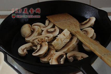 2、锅预热,加入一汤匙油,放入蘑菇翻炒。