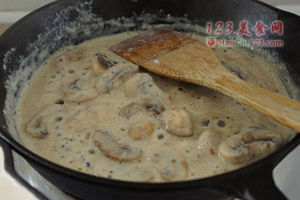 3、蘑菇稍变软后,加入少许海盐和黑胡椒,1茶匙芥末子,翻炒均匀。