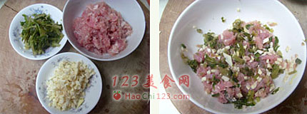 2)肉末、盐和鸡精一同搅拌均匀(做肉末的时候放了几滴绍酒)。