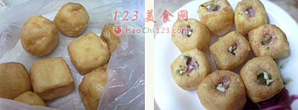 2)油豆腐上用筷子扎洞,放入咸菜肉末,塞满。