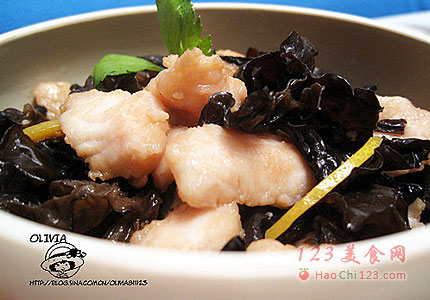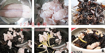 3、把裹着薄淀粉的龙力鱼焯水一分钟,黑木耳焯水三、五分钟左右,捞出淋干水分备用。