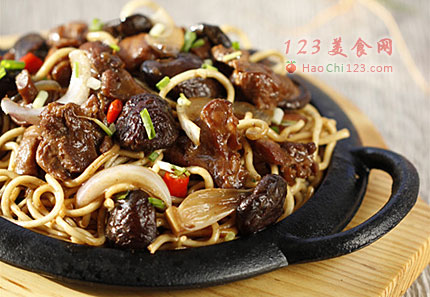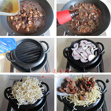 4、铁板先抹层油,再平铺层洋葱,洋葱出香味后就可以关火,再在上面铺上煮熟的面条,最后将烧好的香菇鸡连汤汁一起浇淋在面条表面。[sushi.laoyanhuo.com]
