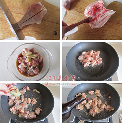 4、烧热锅,放入适量的油,下入腌制好的鸡腿肉翻炒。
