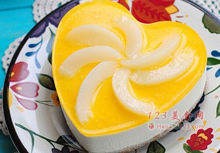 14、倒在蛋糕表面,继续冷藏1小时脱模即可。脱模时用电吹风沿模具吹一圈,或者用热毛巾捂一下即可轻松脱模。