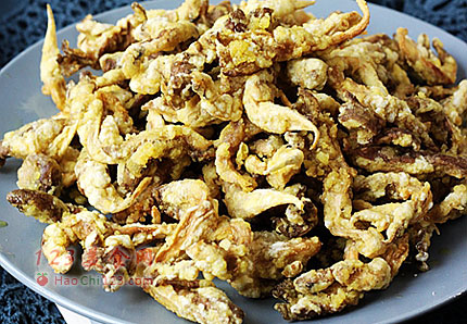 9、全部炸好都捞出来以后,将油锅再烧热,将炸好的蘑菇分次再复炸一次捞出就好了,倒进油中用筷子划拉两下就可以捞出来,不要炸时间长,糊了就不好吃了。