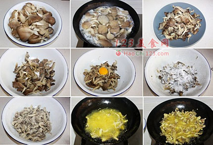 7、将干淀粉和蘑菇抓匀,再将蘑菇抖散,因为蘑菇挤水后因个人的力量不同含水量也不同,合适的淀粉量因该是蘑菇条外表是干的,可以抖散不粘连,如果太干了,可以用手蘸水抖到上面一点就可以了。