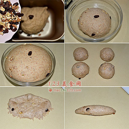 2、揉至葡萄干核桃分布均匀后收圆入盆。
