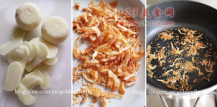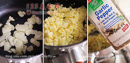 4、炒锅中入橄榄油,后入大蒜片小火香煎至微微金黄,后取出2/3备用。