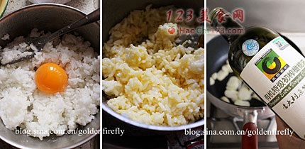 5、锅中留下1/3的蒜片,再将蛋黄米饭倒入锅中,开中大火开始拌炒。