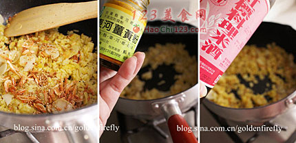 7、做法2的樱花虾芝麻+其余蒜片一起倒入锅中,再洒入姜黄粉,混和持续大火拌炒约2分钟。