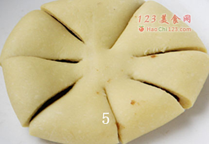 6、檊开面皮,放入豆沙馅,收口,朝下。
