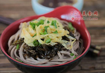 1、吃面啦!放面于碗里,放上一点紫菜和蛋皮丝,撒上芝麻和香葱,倒入一小碟刚才调好的汁,就可以开吃啦!