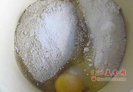 2、加入一个鸡蛋和一点盐,加少量水揉面。