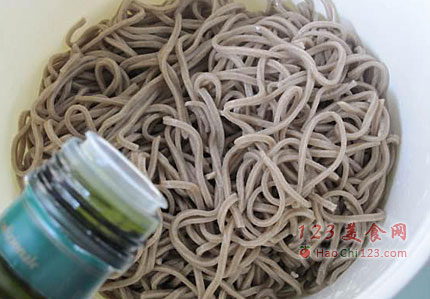 13、过滤掉面条水分,放入适量橄榄油搅拌均匀。