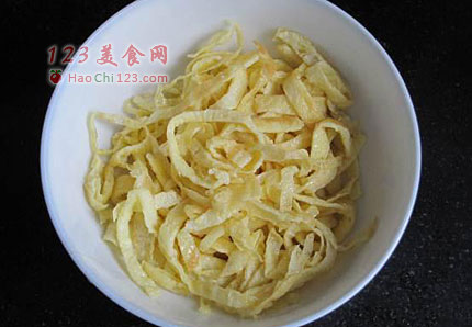 20、热锅后加油,放入鸡蛋液,沿着让蛋液锅边均匀布满锅底。