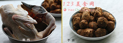 3、芋苗去皮洗净,葱切段,姜拍松。