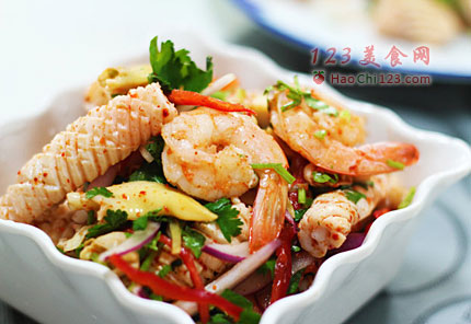 3、焯烫好的海鲜一定要控干水分,放凉之后再拌入配菜,调味。