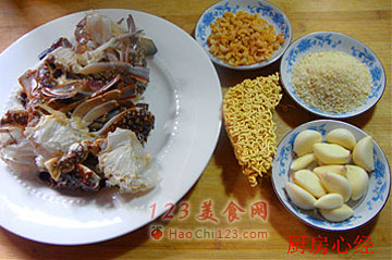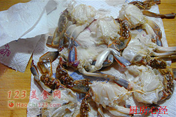 3、将蟹块整理一下,去掉杂物,蟹爪去掉骨节备用。蟹块擦干水分,为油炸做好准备。