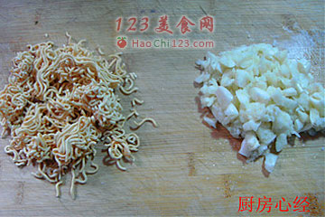 2、将大蒜剁成粒,方便面掰碎备用。