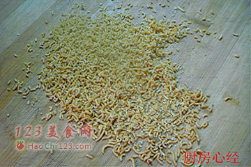 8、然后炸制方便面碎渣,直至浮起即可捞出。捞出方便面碎渣。将炸好的碎渣在案板上碾碎。碾碎的方便面。