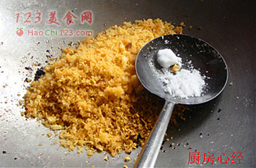 10、另起锅,放油爆香豆豉,然后倒入金沙,放白糖炒匀。