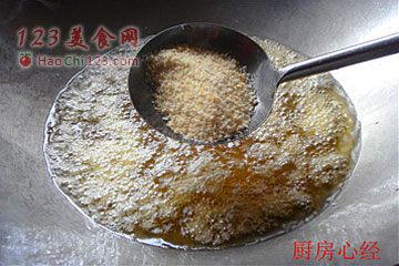 5、大蒜粒要用清水洗过,就不容易炸糊了。但油温也不能过高。待蒜粒水泡减小即可放入面包渣。