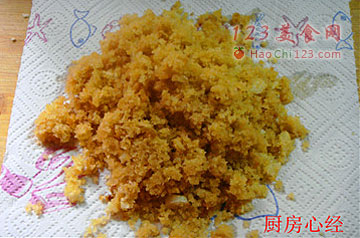 9、然后将炸好的金沙,方便面碎渣;十三香混合在一起,就是诱人的金沙了。