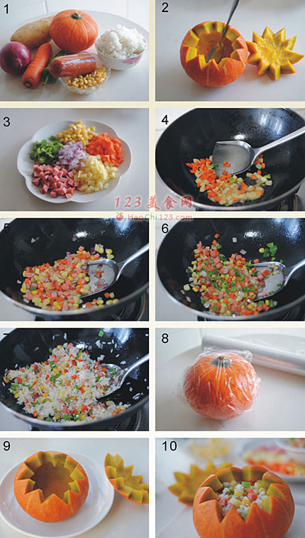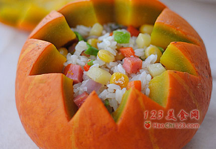 9-10、蒸熟的南瓜,将米饭装入南瓜中即可。