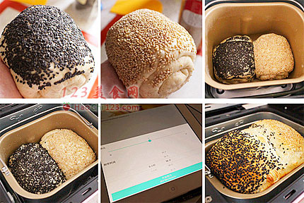 6、两个卷筒面团表面都沾附芝麻(两面团分别沾上黑芝麻&白芝麻)。