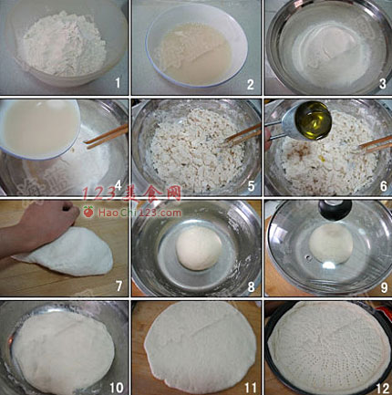 4、11-12图,用擀面杖将面团擀成一个圆形面皮。将面皮放在比萨盘中,用手将面饼整形成与比萨盘同等大小,四周略厚的比萨饼皮。然后用叉子在饼皮上扎数个孔,静置10分钟。