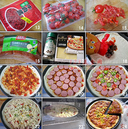 7、22-24图,最后撒上剩余的马苏里拉奶酪和黑胡椒碎。烤箱预热,将比萨放入烤箱中层,上下火,200-210度的温度,烤约20-25分钟。趁热食用。