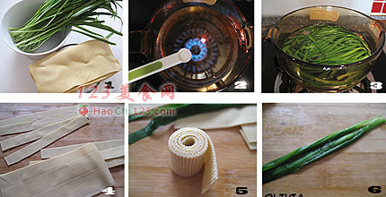 7、卷好的豆卷放在韭菜的一端,韭菜包裹豆卷卷起来。