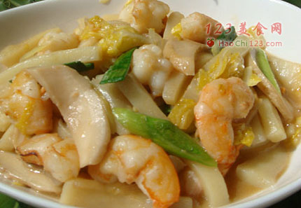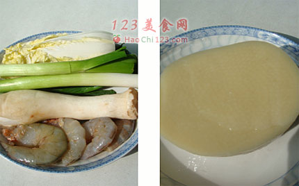 2、大米粿切条、鲜虾拨壳去泥肠、杏鲍菇、娃娃菜、蒜苗洗净切条备用。