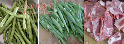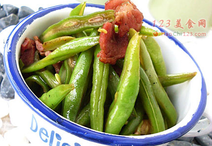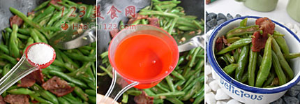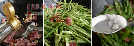 6、放入豆角丝反复翻炒,炒至豆角完全变成翠绿色的时候放少许糖。