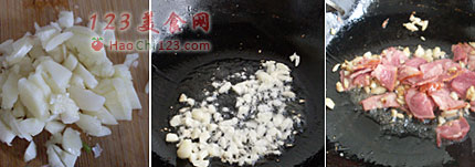 3、锅里放少许油,油热后放入蒜粒煸炒至微黄色。