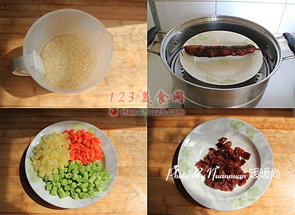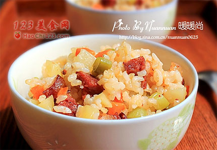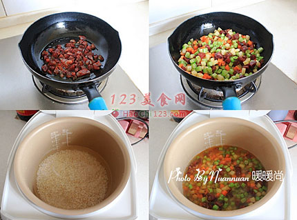 8、将炒过的腊肠和蔬菜丁一起倒入电饭锅内,盖上盖,按下煮饭键,待提示米饭煮好后再焖10-20分钟即可享用。