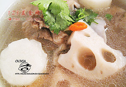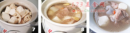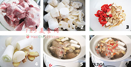 7、半小时左右后,把莲藕山药放入汤中,小火煮炖。