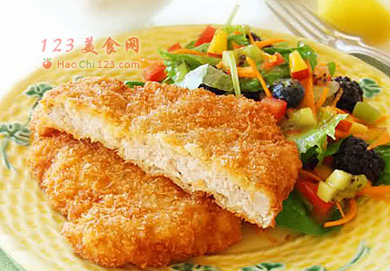 4、炸制猪扒的时候火不能太大,时间不能太长,一面颜色金黄后立即翻面,否则肉质太老,而且容易炸糊。