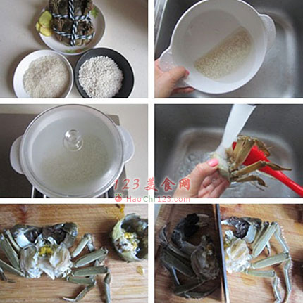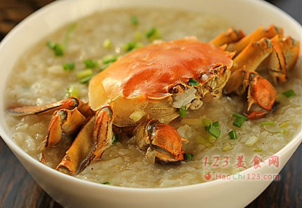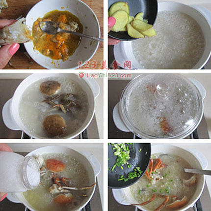 3、待粥熬煮到八成熟时,加入姜片和处理好的螃蟹同煮,煮好后加入盐、白胡椒粉调味,最后加入小葱末即可。