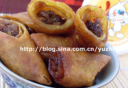 8、炸好的咯扎签外皮酥脆,肉馅咸香(咯扎签外皮的酥脆主要取决于买到的咯扎的好坏,好的咯扎炸完以后很酥很催,但是也有个别的掺杂了其它东西的咯扎会越炸越软,那样就影响了咯扎签子的口感了)。