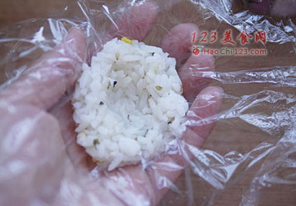 4、中间稍按压加入香菇三文鱼,上面再加入一小块米饭,隔保鲜膜团圆就可以了(内馅可以换做肉松、火腿、沙拉都可以)。