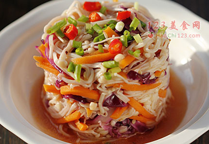 1、凉拌金针菇可以适量加入点配菜,随意搭配,尽量颜色丰富些。