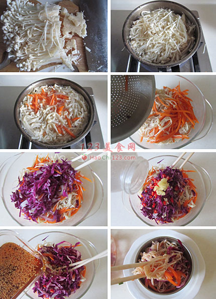 2、金针菇多切去点底端的根口感会更嫩些,提前焯煮熟过凉。