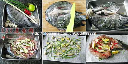 8、鱼身上铺放辣椒圈、柠檬块、香茅段和葱段,入预热至220°C烤箱烤制30-40分钟左右,烤至鱼身表面焦黄即可。