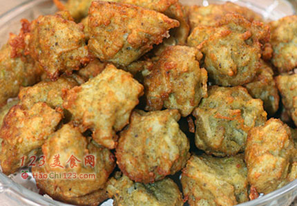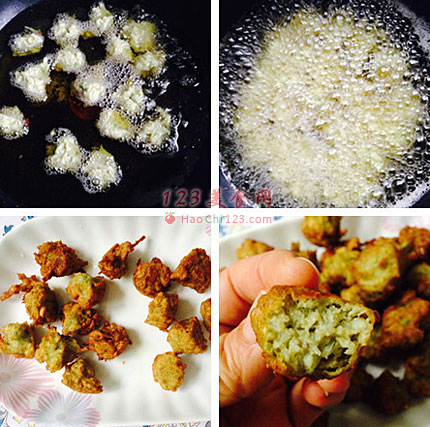 8、抓一把拌好的萝卜丝糊糊,用手虎口一挤,用汤勺一挖,就出来一个丸子,放在热油锅里。