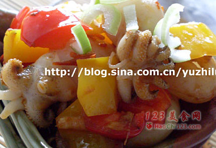 4、放入准备好的目鱼仔煸炒几下,然后放入彩椒丁翻炒均匀。